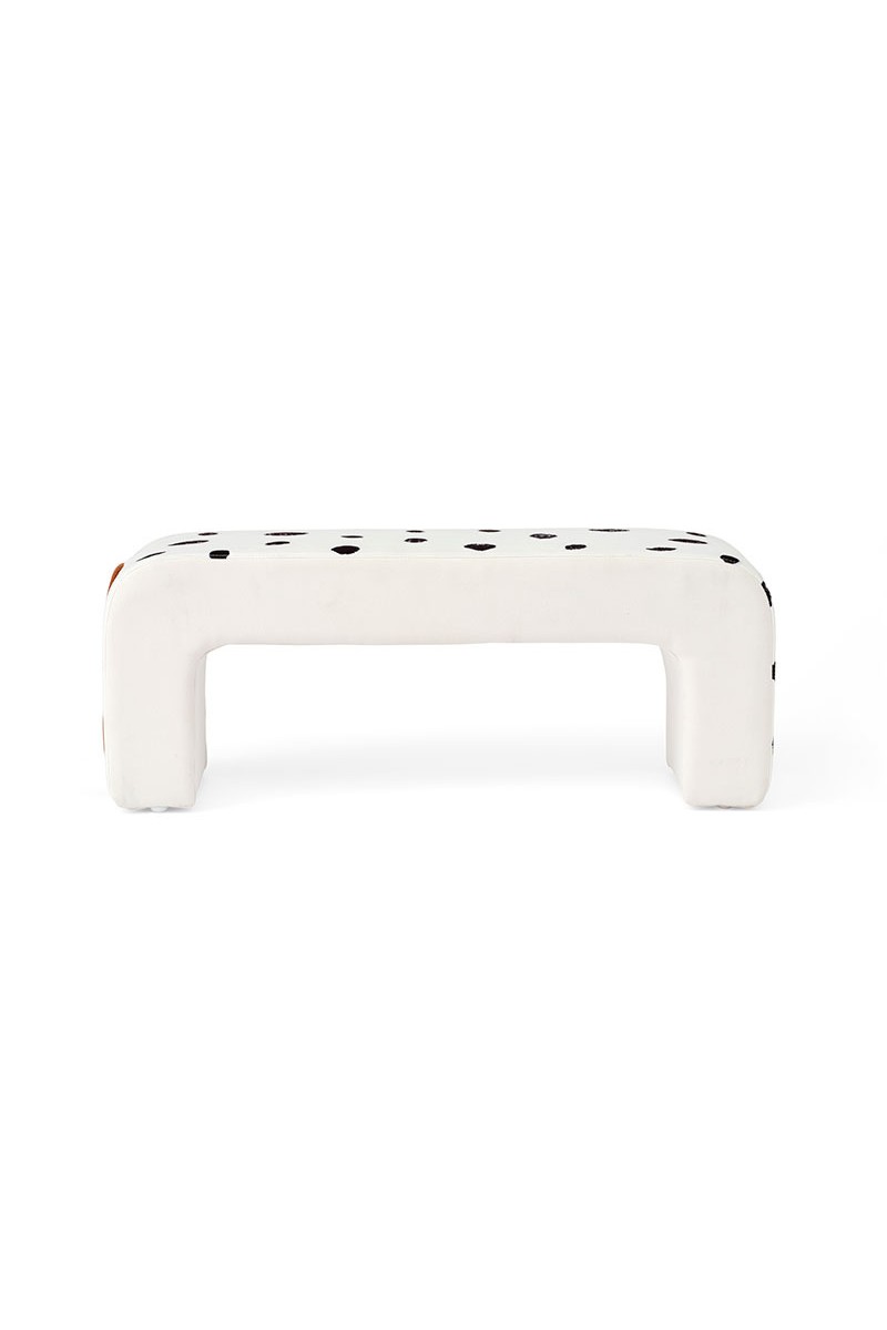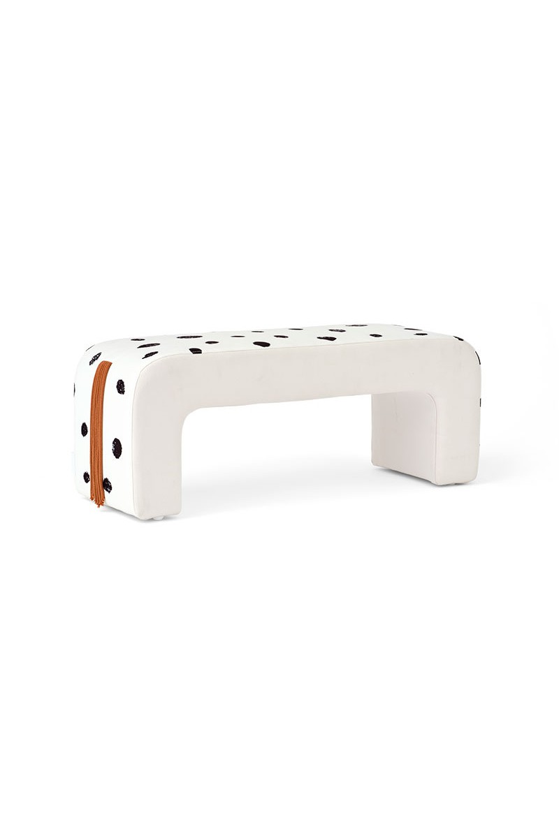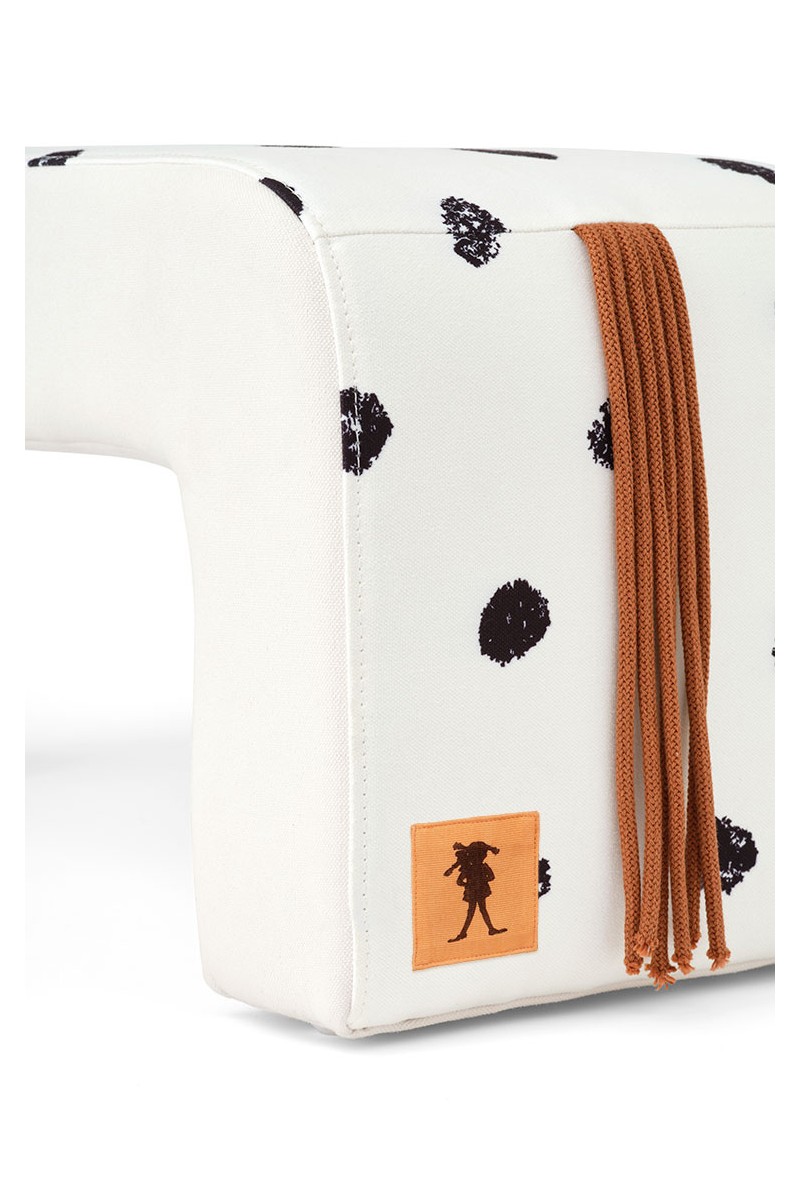 W wielu historiach Pippi Długoskarpetka z właściwą sobie pewnością siebie wskakuje na grzbiet swojego konia i rusza przed siebie – bez siodła, bez zbędnych ceregieli. Ta długa, wyściełana ławka czerpie inspirację właśnie z tego ducha wolności. Tapicerowana tkaniną w kropki, przywodzi na myśl cętkowaną sierść Lilla Gubben, a jej miękko zaokrąglone końce zapraszają do odpoczynku.
