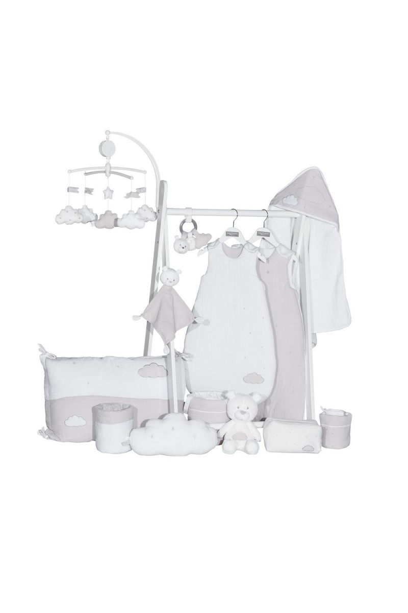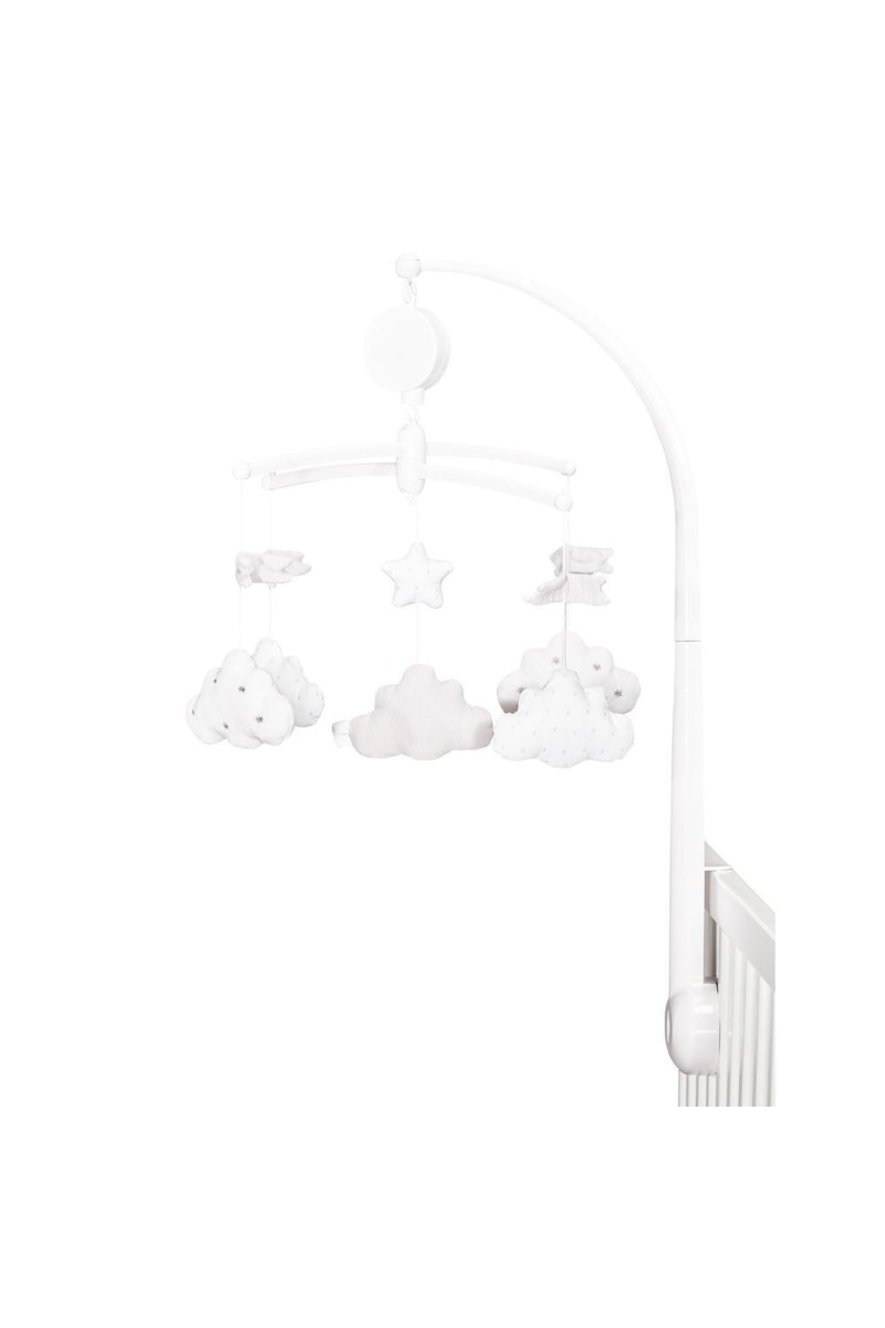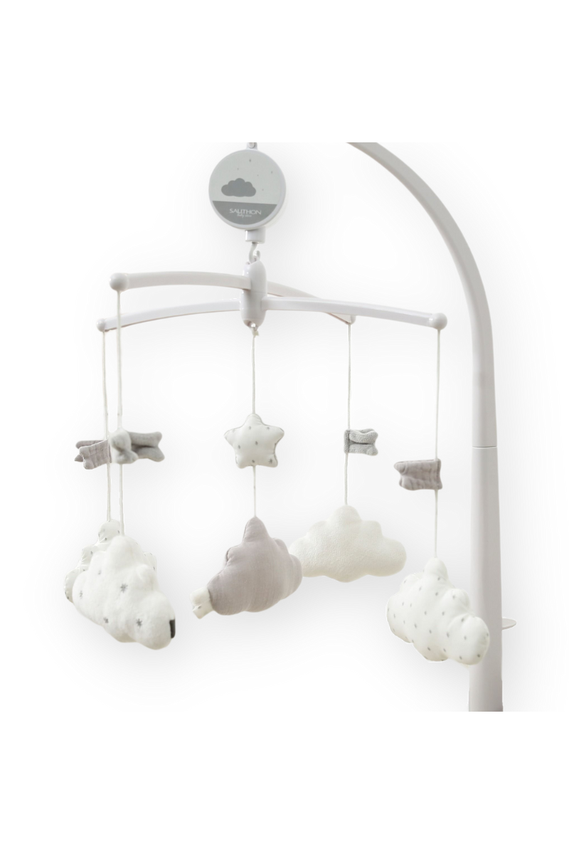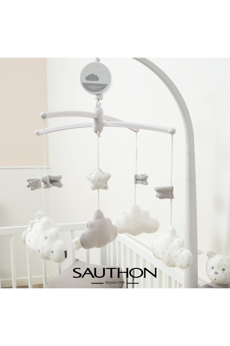 Karuzela z pozytywką do łóżeczka Sauthon LILY GREY „Szare Chmurki” to idealny dodatek do wyprawki, który łączy piękny design, bezpieczeństwo i funkcję wyciszającą. Delikatne, pluszowe chmurki przyciągają wzrok maluszka, a spokojna, klasyczna melodia pomaga mu się zrelaksować i zasnąć.