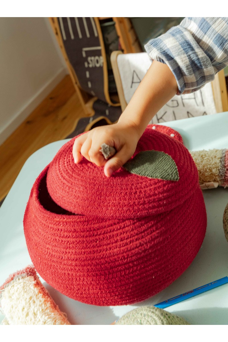 Nie ma powrotu do szkoły bez jabłka na biurku! Ten uroczy, ręcznie wykonany kosz w kształcie lekko spłaszczonego czerwonego jabłka to wyjątkowy i praktyczny dodatek do każdego dziecięcego pokoju. Wykonany z bawełnianego sznurka wypełnionego włóknami z recyklingu butelek PET, zachwyca trwałością i miękkością.
