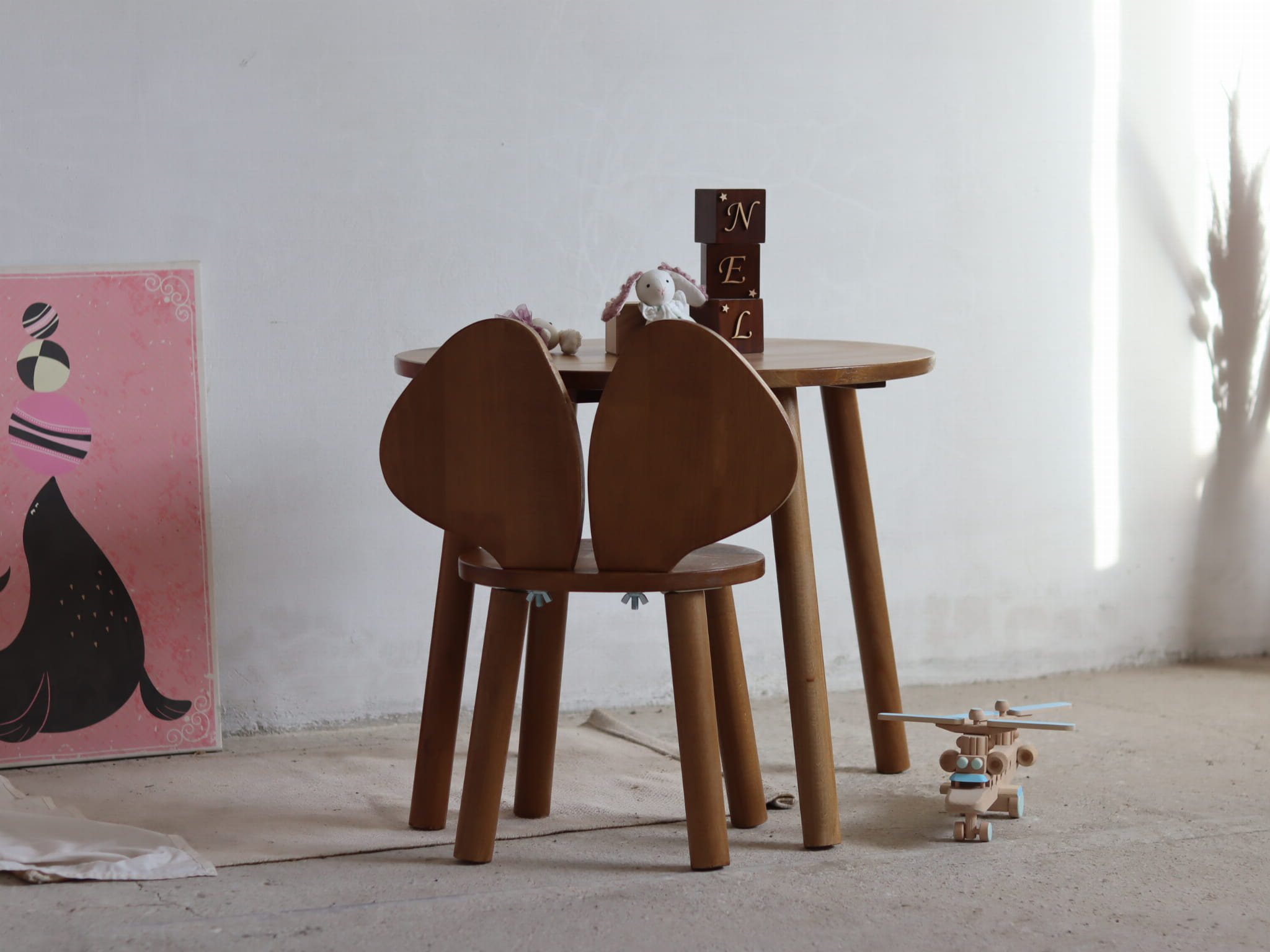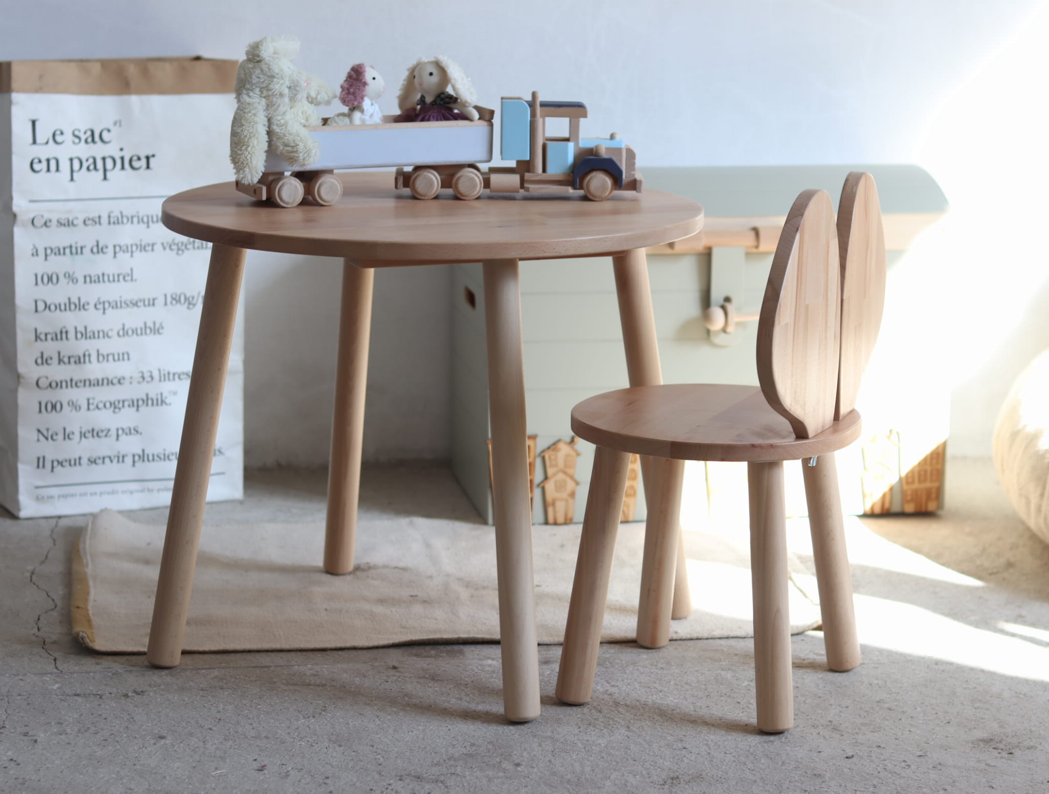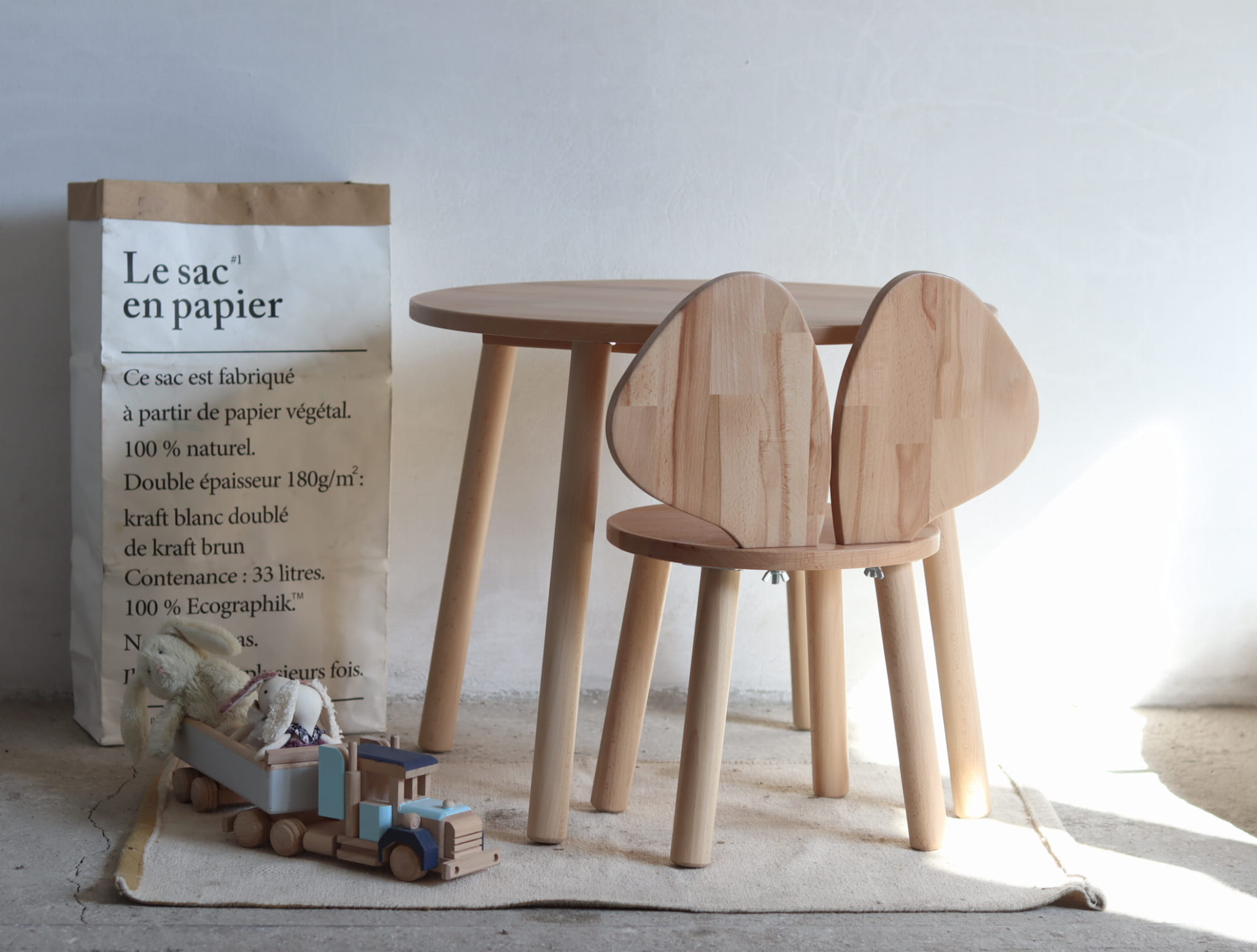 Drewniany zestaw MYSZ ROUND to pełen uroku komplet mebelków do pokoju dziecka. Charakterystyczne oparcie krzesełka w kształcie myszki oraz idealnie gładki, okrągły blat pobudzają wyobraźnię i zachęcają do twórczej zabawy.