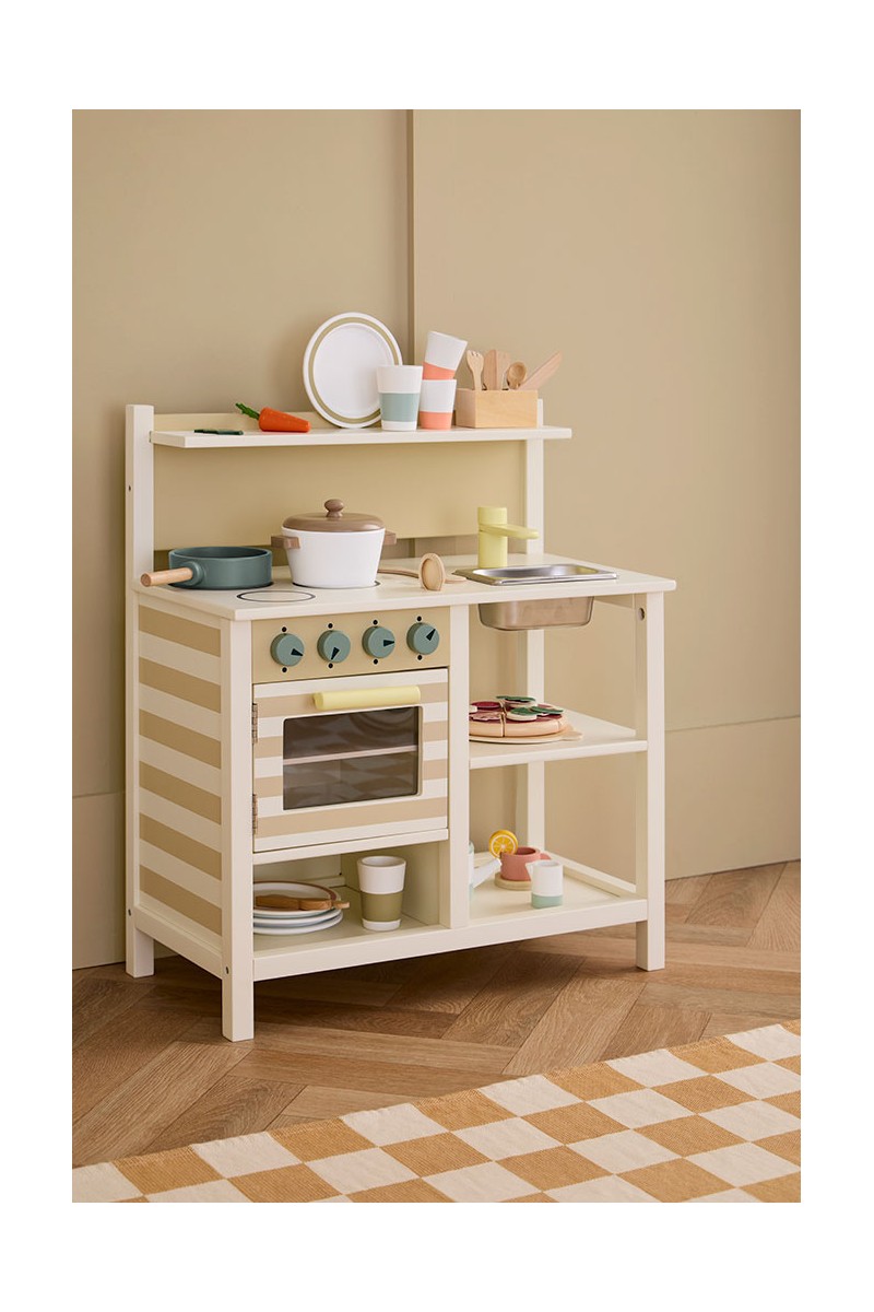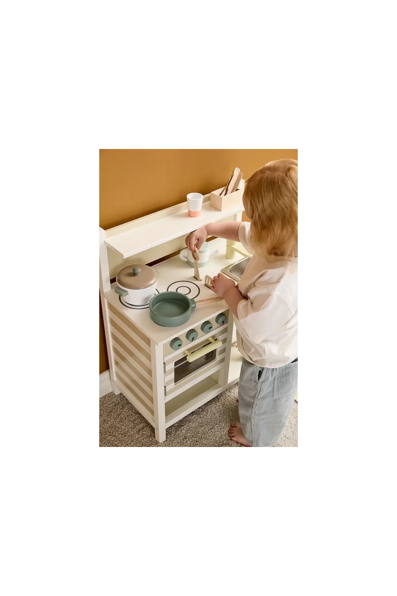 Wyposażona w otwierany piekarnik z wyjmowaną blachą, komplet garnków z uniwersalną pokrywką oraz trzy drewniane narzędzia: łyżkę, łopatkę i łyżkę cedzakową. Wszystko można łatwo uporządkować dzięki dedykowanym otworom na blacie i półce na drobiazgi. Pod blatem znajduje się dodatkowa otwarta przestrzeń do przechowywania naczyń lub akcesoriów.