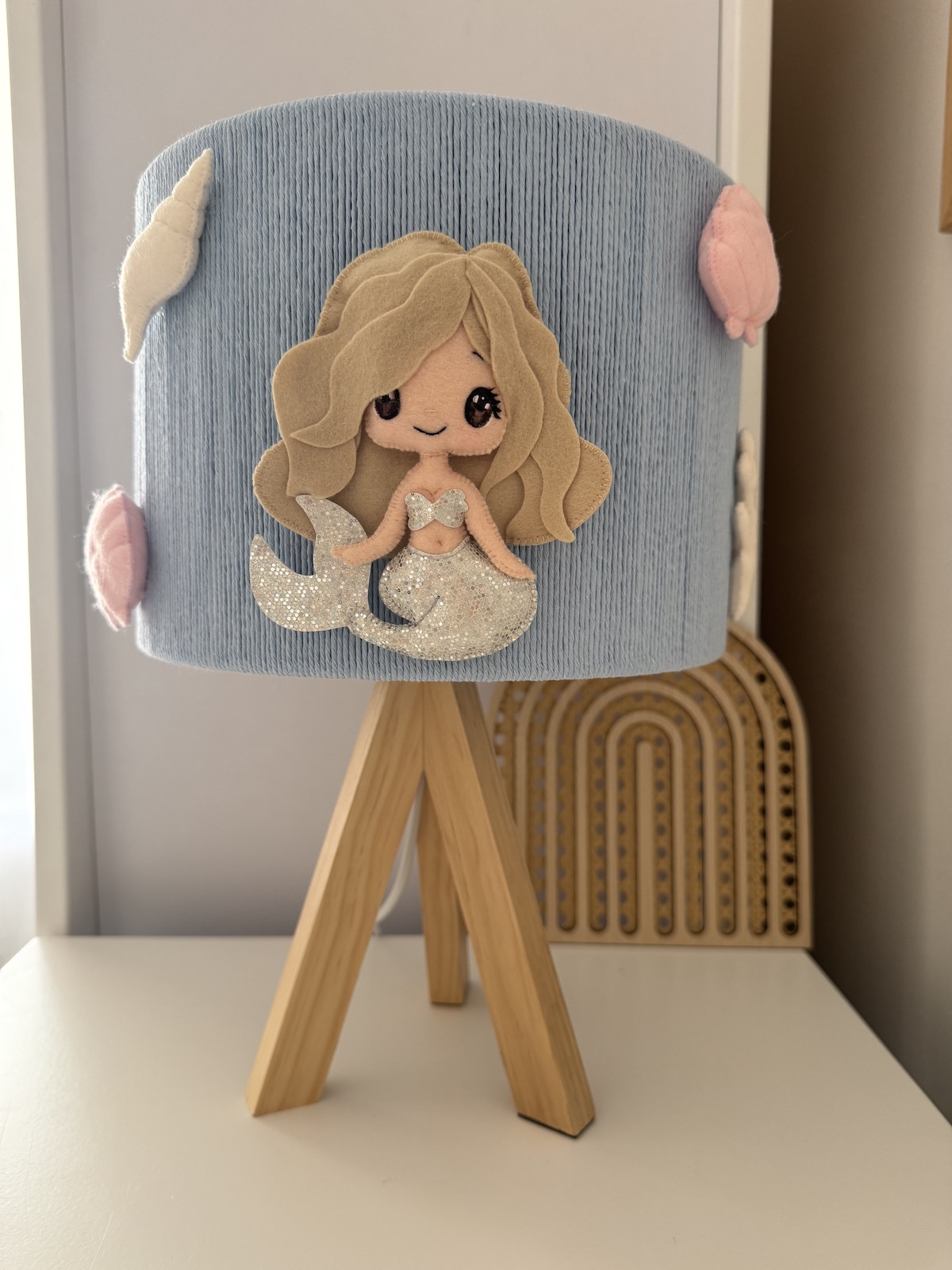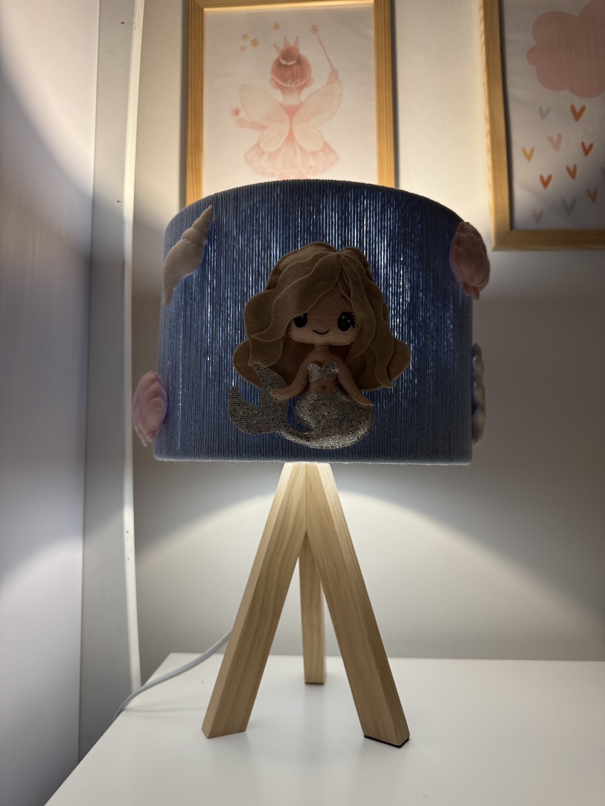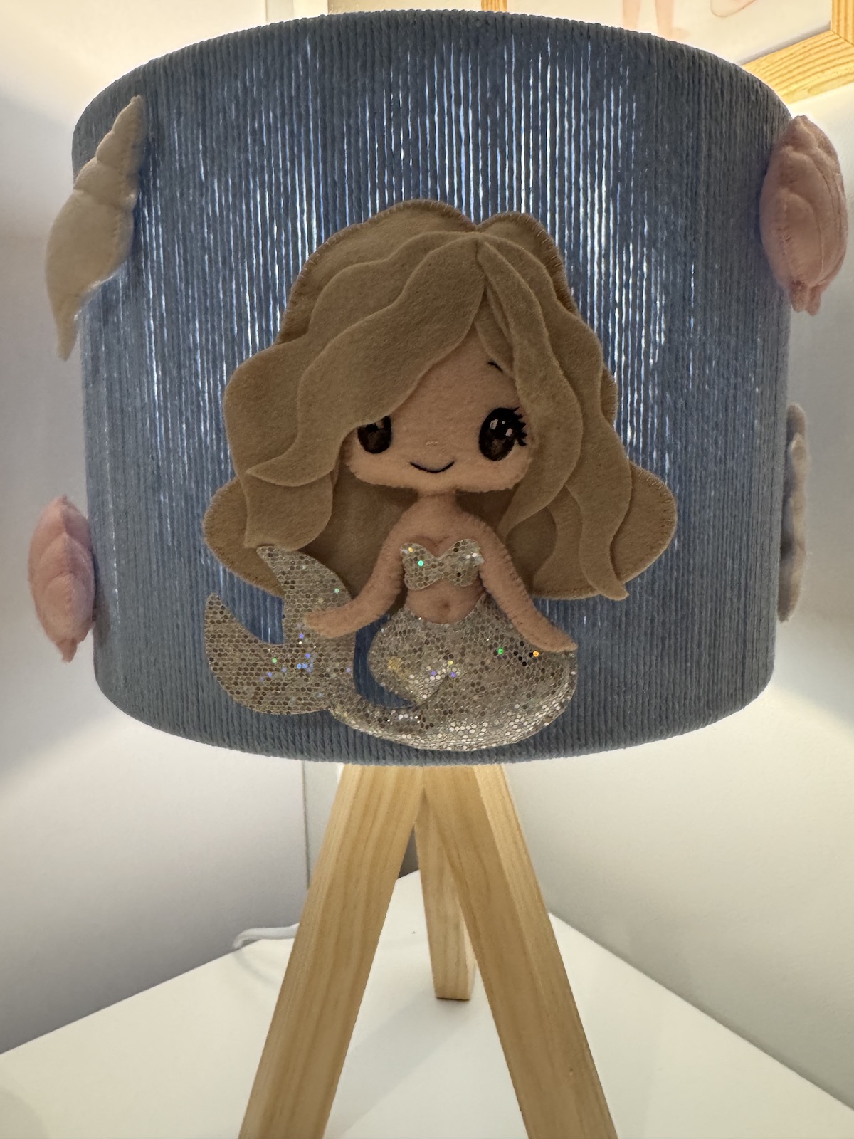 tylowa i wyjątkowa lampka nocna dla dzieci z motywem syrenki to idealna propozycja do przytulnego pokoju dziewczynki. Niebieski klosz ozdobiony ręcznie aplikacjami z filcu przedstawia uroczą syrenkę oraz elementy świata morskiego, takie jak muszelki i koralowiec.