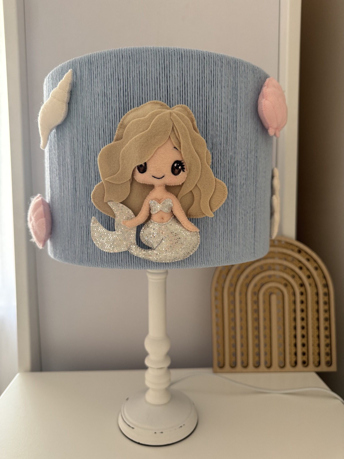 Wyjątkowa lampka nocna dla dzieci z motywem syrenki to idealne połączenie funkcjonalności i bajkowej estetyki. Delikatny, niebieski klosz ozdobiony ręcznie aplikacjami z filcu przedstawia uroczą syrenkę oraz elementy morskiego świata – muszelki i koralowiec.