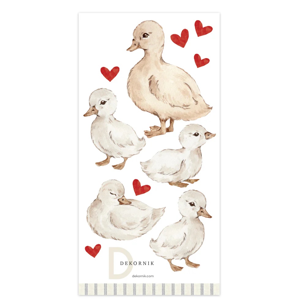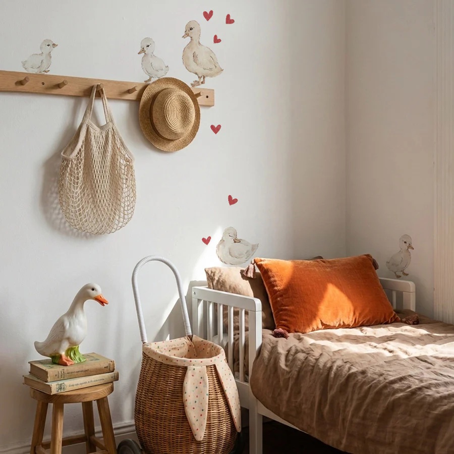 Te małe naklejki z kaczuszki to ekspresowy sposób na udekorowanie ściany i stworzenie przytulnego kącika w pokoju. Kaczuszki mają ok. 10–20 cm, a serduszka 2,5–4 cm. Naklejanie jest bardzo proste — wystarczy oderwać wierzchnią warstwę i przykleić je w wybranym miejscu. Przy odpowiednim rodzaju ściany naklejki powinny dać się odkleić bez większego problemu.
