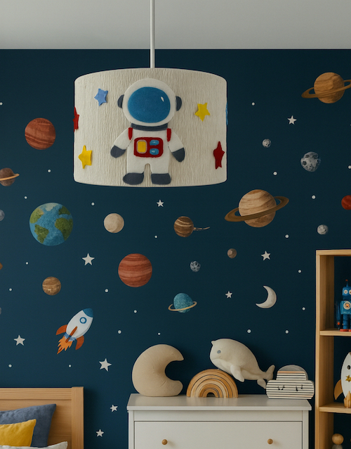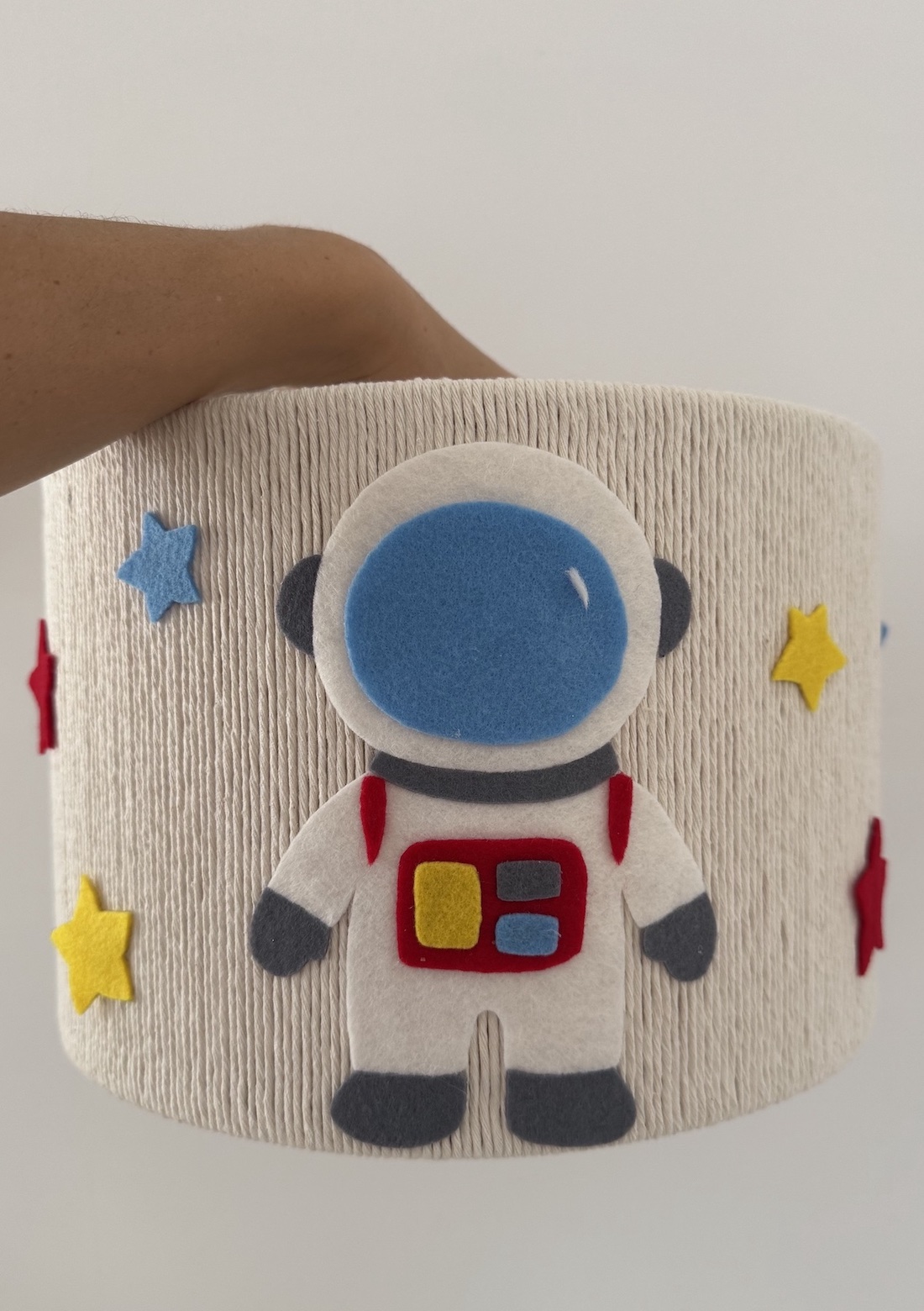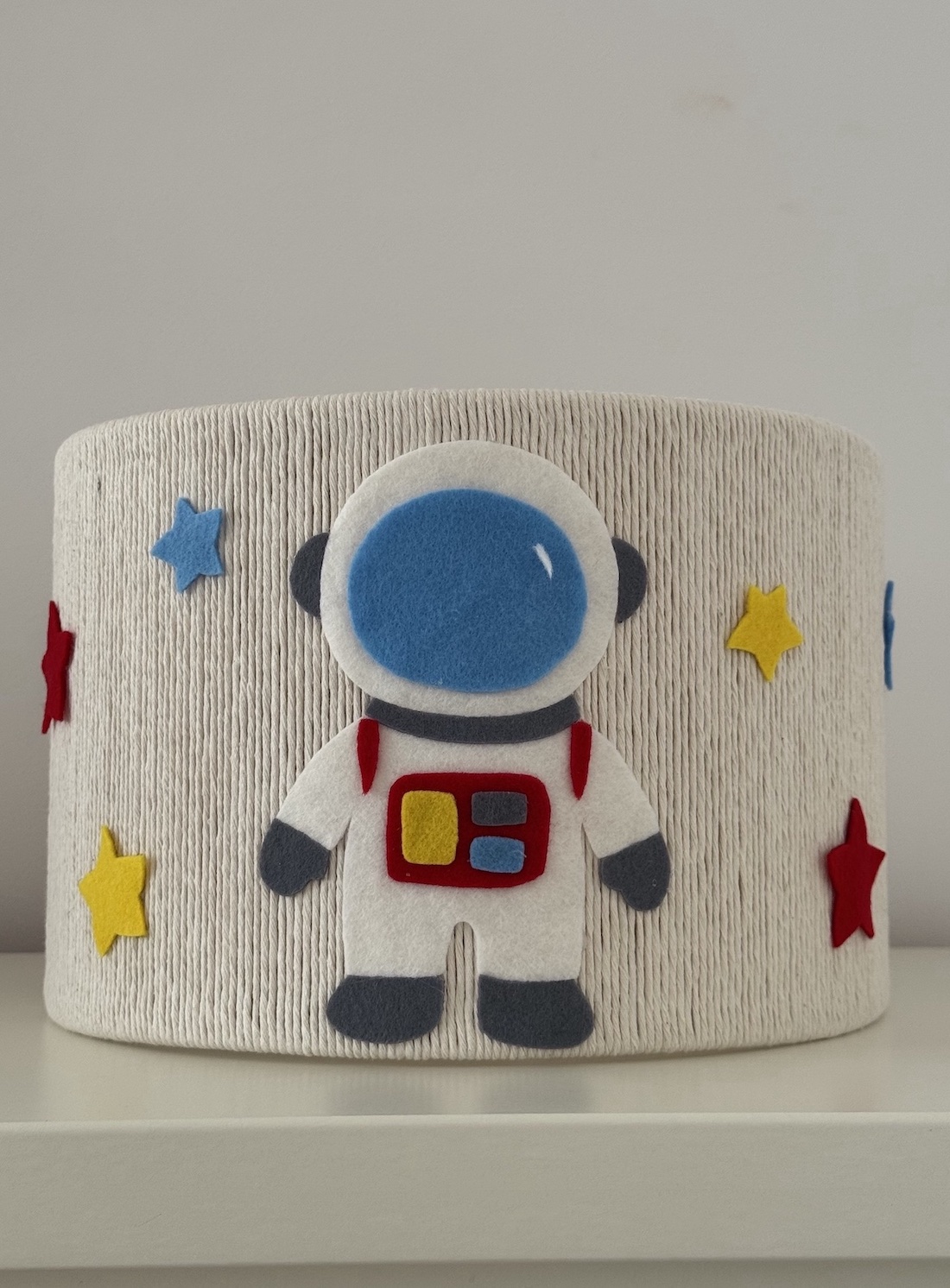 Ręcznie wykonana lampa Astronauta to wyjątkowy element dekoracyjny, który wniesie do pokoju dziecięcego magiczny, kosmiczny klimat. Jej klosz wykonany jest z kremowego sznurka, dzięki czemu delikatnie rozprasza światło i tworzy ciepłą, przytulną atmosferę.
