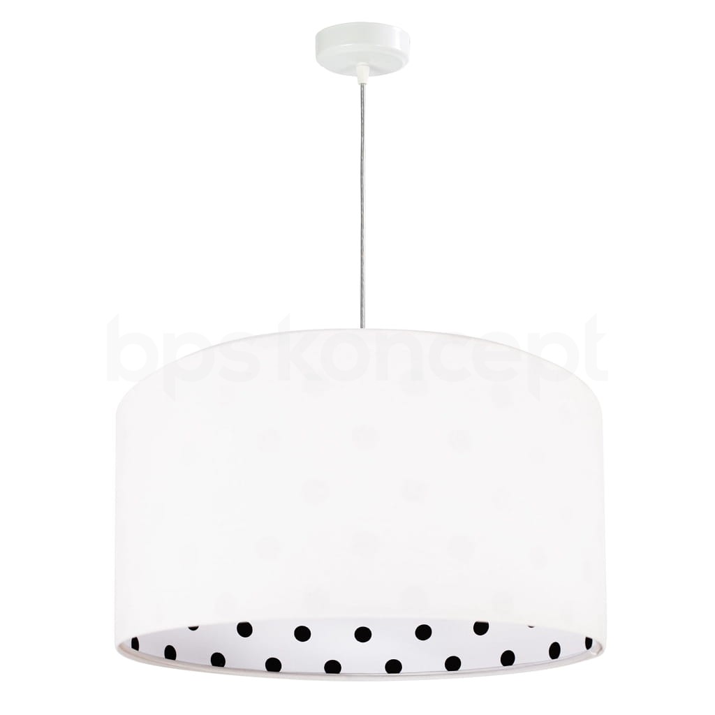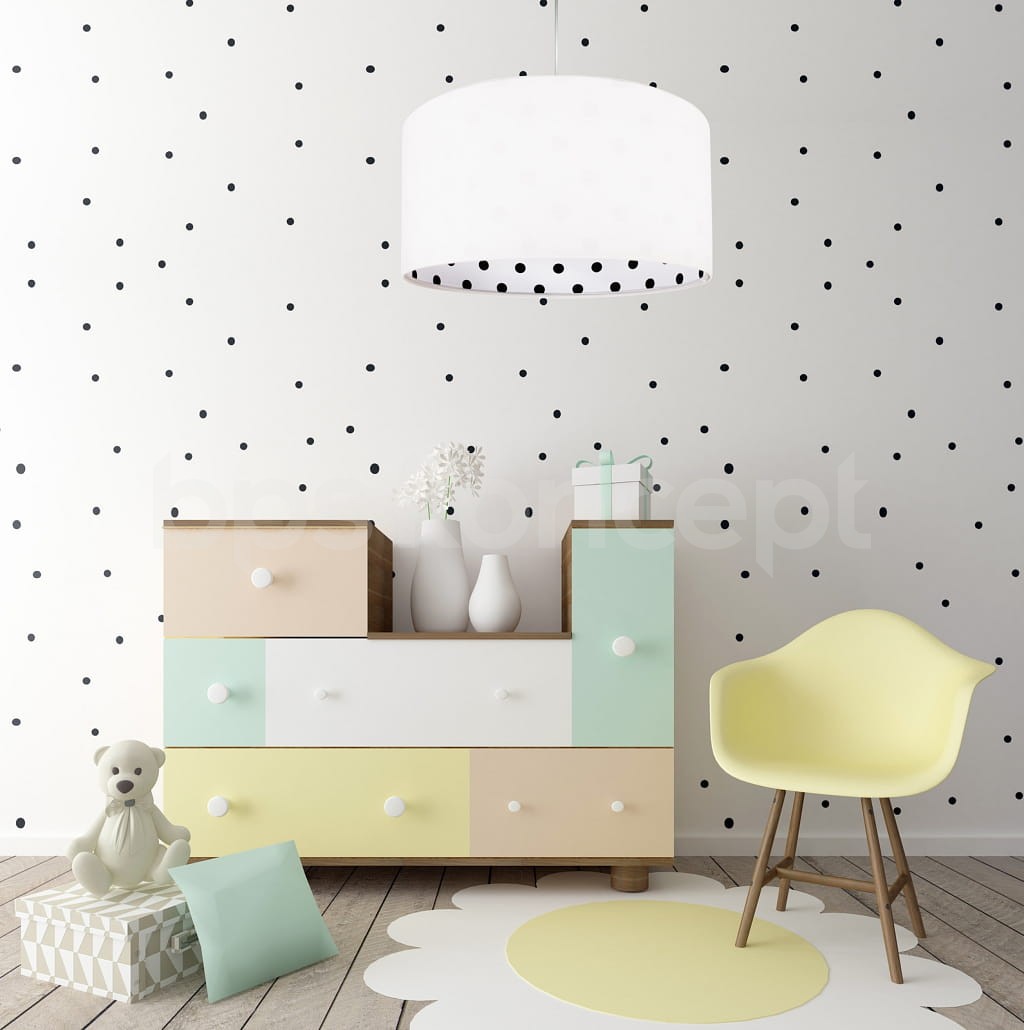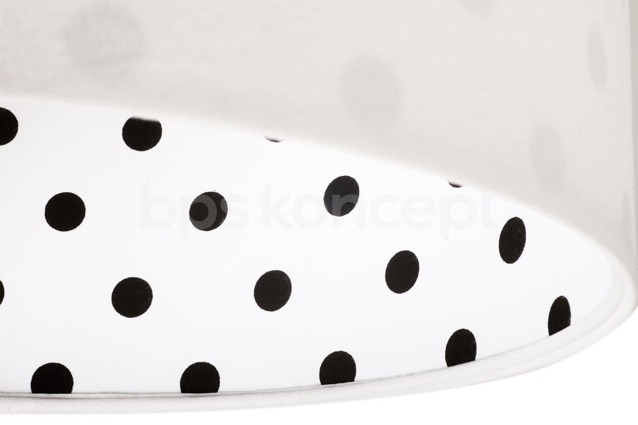 Abażur lampy Calineczka to elegancka propozycja do pokoju dziecka i nie tylko. Wykonany z białego weluru, prezentuje się niezwykle subtelnie i delikatnie. Wnętrze ozdobione jest tkaniną w czarne grochy, co nadaje całości wyjątkowego charakteru. Dzięki zastosowaniu materiału odpornego na promienie UV, abażur nie blaknie i długo zachowuje świeży wygląd.