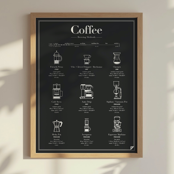 To nie tylko plakat do kuchni, ale również praktyczna ściąga dla domowego baristy. Sprawdzi się zarówno jako dekoracja ściany, jak i pomoc podczas codziennego parzenia kawy.