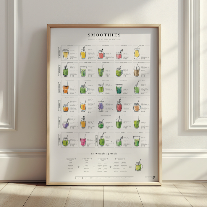Plakat „Smoothies” to rozbudowana infografika przedstawiająca 30 przepisów na zdrowe i pyszne koktajle na każdą okazję.