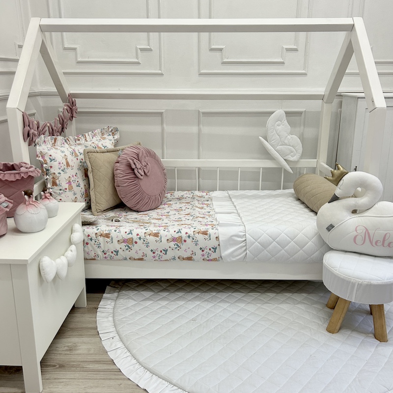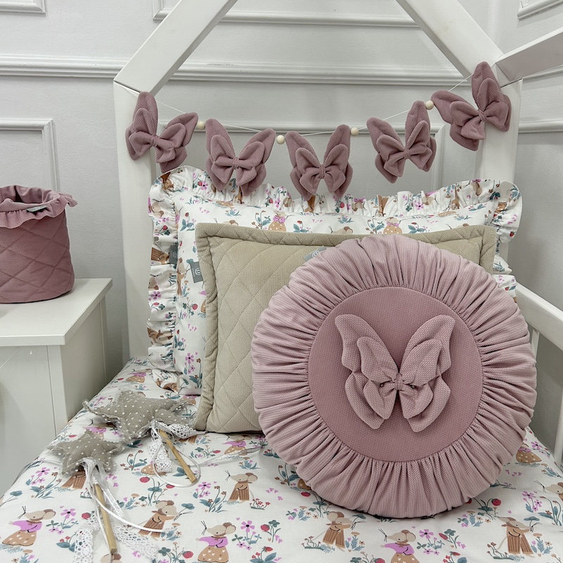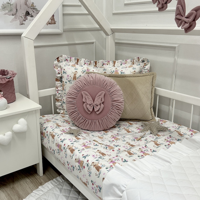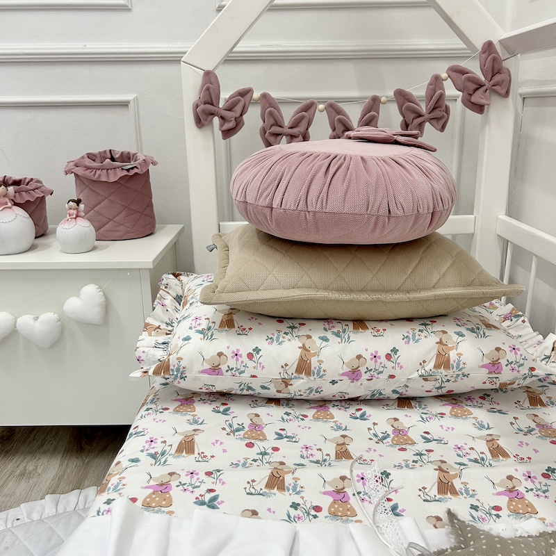 Materiał jest miękki, przyjemny w dotyku i przewiewny, co zapewnia dziecku komfort snu o każdej porze roku. Subtelny wzór w myszki dodaje wnętrzu dziecięcego pokoju lekkości i elegancji.
