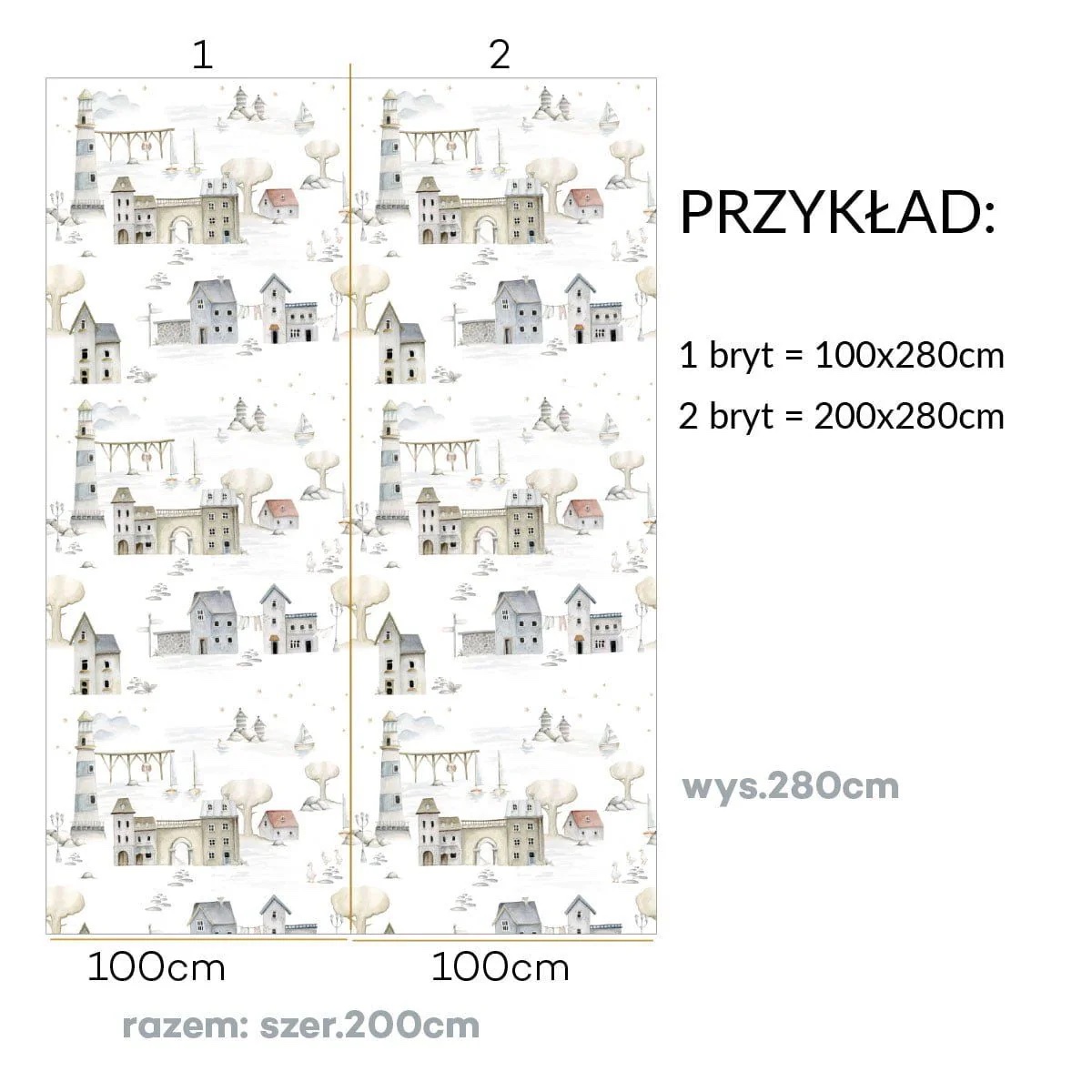 Małe domki, most z kamienia, latarnia… Piękny klimat wakacji i bajek do pokoiku zarówno chłopca, jak i dziewczynki. Szczególnie potęgują to kolory, które są utrzymane w delikatnej palecie brązów i błekitów.