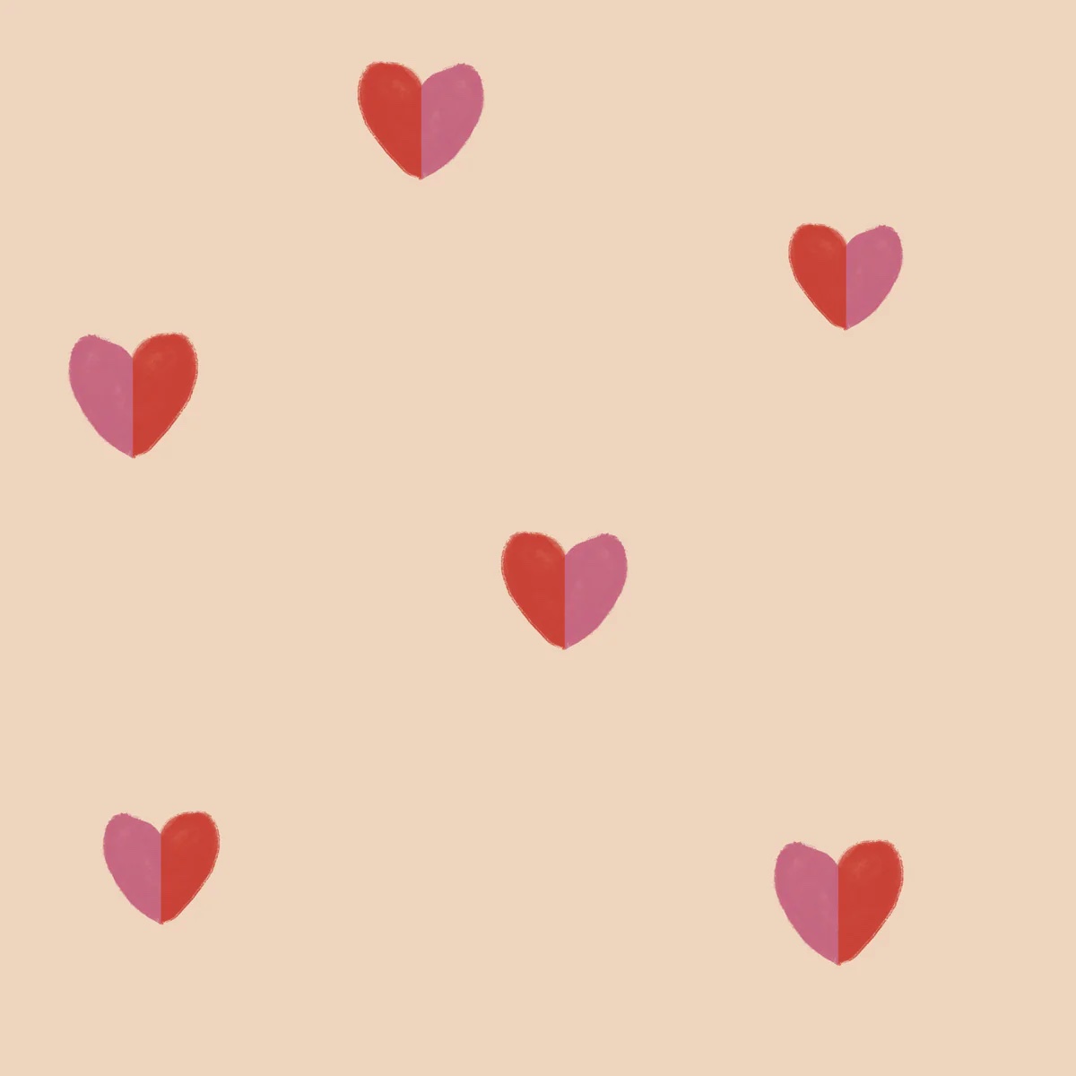 Mierzace 6 cm sliczne dwukolorowe serduszka. Niezbyt gęsto rozłożone na tapetecie, dlatego wzór nie jest mocny, pstrokaty. Tło tapety jest beżowe z lekkim zabarwieniem brzoskwiniowym.