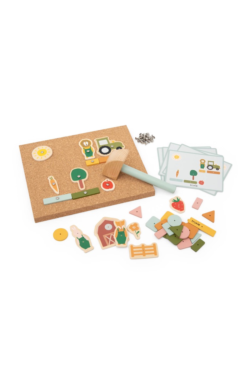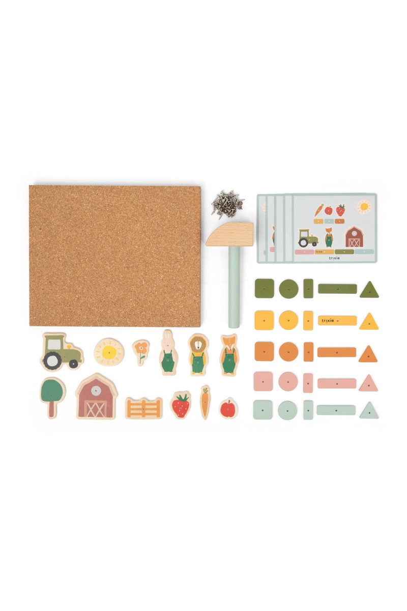 Z tą wyjątkową drewnianą zabawką młodzi odkrywcy mogą tworzyć niezliczone scenki z życia na farmie! Wystarczy ułożyć elementy – traktor, stodołę, zwierzątka i wiele innych – na korkowej tablicy i delikatnie „przybić” je młotkiem. Maluch może odtwarzać obrazki z kart lub tworzyć własne historie, rozwijając wyobraźnię, kreatywność i zdolności manualne.
